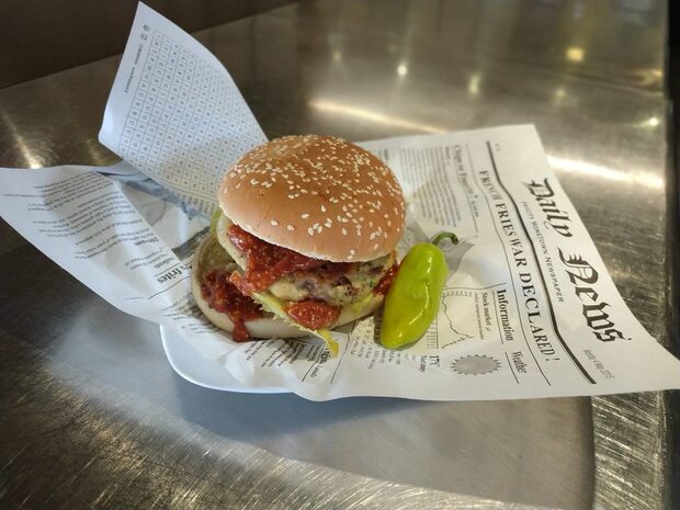 ✺ Рибен бургер - сьомга, скариди, каперси, сушени домати, доматено-горчичен сос и пържен лук