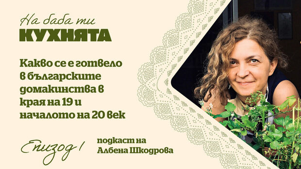 Какво се е готвело в българските домакинства в края на 19-ти и началото на 20-ти век? Кои ястия са всъщност част от "традиционната" кухня по нашите земи и действително са се приготвяли в десетилетията след създаването на съвременната българска държава?На тези въпроси отговаря първият епизод на "На баба ти кухнята" - нов подкаст на "Бакхус" и "Дневник", създаден от Албена Шкодрова. Тя е журналист и историк, бивш главен редактор на списание "Бакхус". Автор е на книгите "Соц гурме" (Жанет 45, CEU Press) и "Бунтовните готвачи" (Bloomsbury), както и на текстове за историята на храната и съвременната социална история на Европа. В момента работи по изследване във Факултета по политически науки и координира Центъра за Централна и Източна Европа на университета в Льовен.