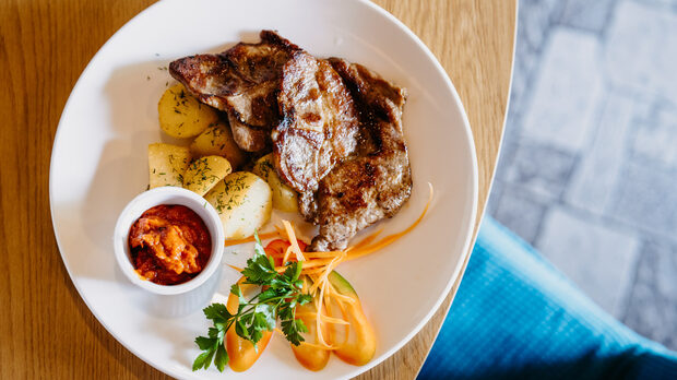 След ClassiX, следващата ми спирка беше Кайрака - едно малко, семейно ресторантче, което веднага те обгръща с топлина и уют. Името му идва от фамилията на хората, които го държат, а това сякаш добавя още повече чар на мястото. Тук опитах свински врат с масло, приготвен така, че да се топи в устата. Разбира се, на масата имаше и добре познатите пържени картофки с риган, както и пица с пеперони, която добави малко пикантност и допълни цялото преживяване.
